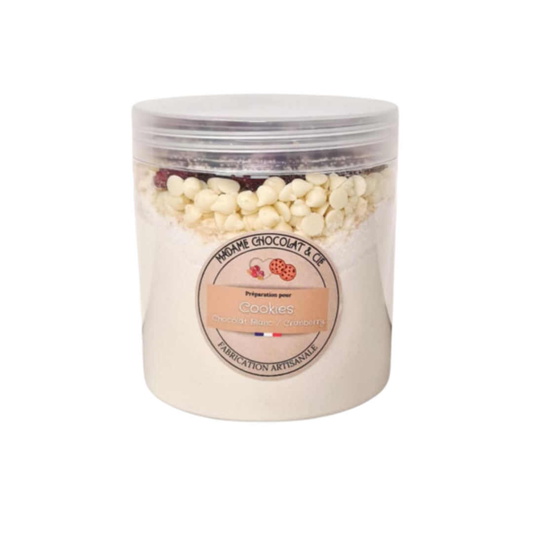 Ingrédients : Farine de blé, cassonade, sucre, pépites de chocolat blanc, cranberry ( huile de tournesol ), levure chimique ( sel ) . émulsifiant : E322, allergènes ( fruits à coques / gluten / lait )