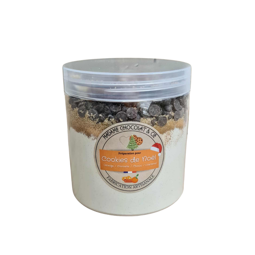 Préparation sèche pour faire chez vous de délicieux cookies de Noël, aux saveurs d'orange, de chocolat, de cannelle et de caramel !