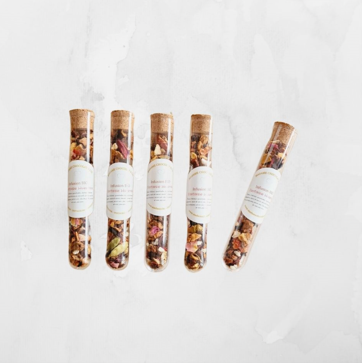 La fantaisie hivernale bio s’appuie sur un mélange classique acidulé de pomme / hibiscus / cynorhodon. La fantaisie est apportée par le gingembre et les pop-corn. Oui! Vous avez bien lu, du pop-corn. Les bâtons de cannelle sont là pour la touche hivernale.