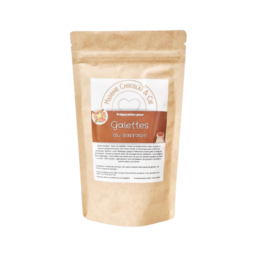 Mode d'emploi : Dans un saladier, verser la préparation. Faire un puit et ajouter progressivement 50cl d’eau froide en fouettant pour éviter les grumeaux. Ajouter 1 œuf. Mélanger jusqu’à l’obtention d’une pâte à crêpe un peu épaisse. Couvrir et laisser poser 1h à température ambiante ( ou au frigo si plus longtemps ). Cuire dans une poêle avec un peu de matière grasse, en recto et verso. Idée recette : agrémenter avec du jambon, du gruyère, un œuf et autres selon vos envies