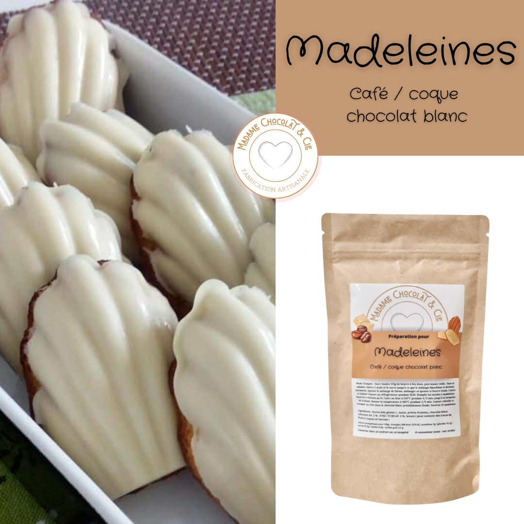 Mode d'emploi : Faire fondre 125g de beurre à feu doux, puis laisser tiédir. Dans un saladier, battre 2 œufs et le sucre jusqu’à ce que le mélange blanchisse et devienne mousseux. Ajouter le mélange de farine, mélanger et ajouter le beurre fondu. Couvrir et laisser reposer au réfrigérateur pendant 1h30. Remplir les moules à madeleines beurrés et farinés au ¾. Cuire au four à 220°C pendant 4/5 min. jusqu’à la formation de la bosse. Baisser la température à 180°C pendant 5/6 min. Laisser refroidir et tremper un côté dans le chocolat blanc préalablement fondu. Environ 10 madeleines