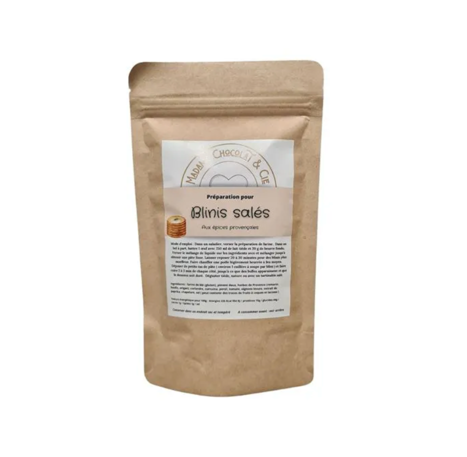 Mode d'emploi : Dans un saladier, verser la préparation de farine . Dans un bol à part, battre 1 œuf avec 250 ml de lait tiède et 20 g de beurre fondu. Verser le mélange de liquide sur les ingrédients secs et mélanger jusqu’à obtenir une pâte lisse. Laisser reposer 20 à 30 minutes pour des blinis plus moelleux. Faire chauffer une poêle légèrement beurrée à feu moyen. Déposer de petits tas de pâte ( environ 1 cuillère à soupe par blini ) et faire cuire 2 à 3 min de chaque côté, jusqu’à ce que des bulles apparaissent et que le dessous soit doré. Déguster tiède, nature ou avec un tartinable salé.