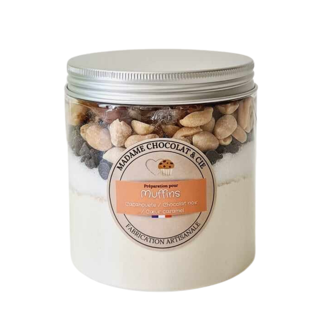 Ingrédients : farine de blé, sucre, caramel beurre salé ( glucose, beurre, lait ), pépite de chocolat noir, cacahuète, cassonade levure chimique ( sel ) . émulsifiant : E322, allergènes ( fruits à coques / gluten / lait )