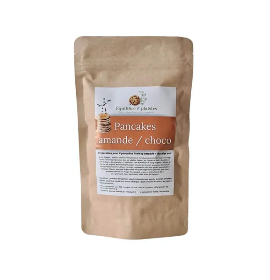 Découvrez notre sachet de préparation pour pancakes amande & chocolat – version healthy : un mélange simple et rapide pour des matins tout doux.